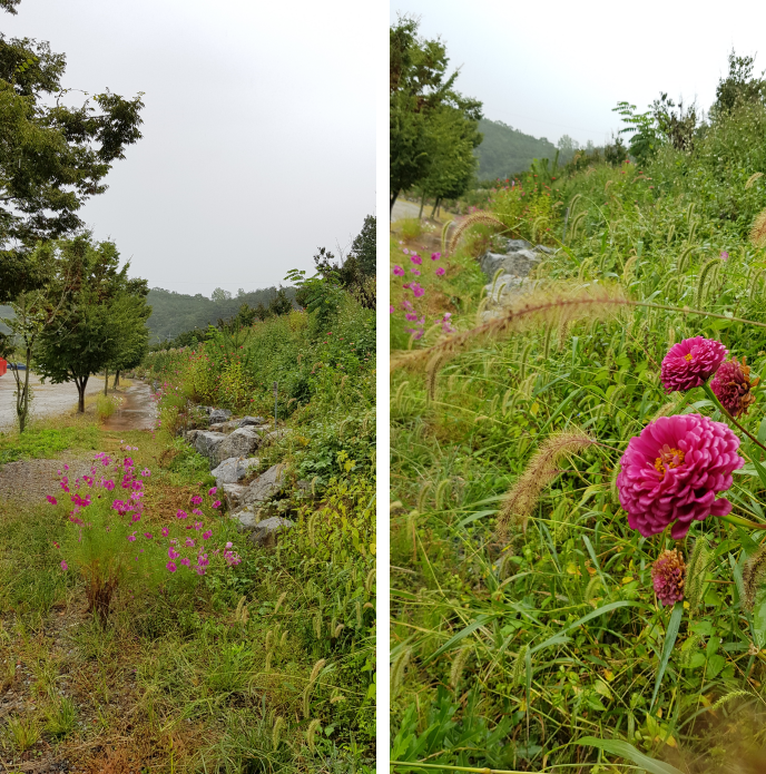 9월 말 현재 대표적인 꽃들이 코스모스와 백일홍입니다. 산막이옛길 주차장으로 들어가는 도로 옆에 이 꽃들이 많이 피어 있는데 비가 와서 그런지 백일홍 색감이 영 우중충했습니다. 하지만 코스모스가 눈물을 머금고 반겨주더군요.