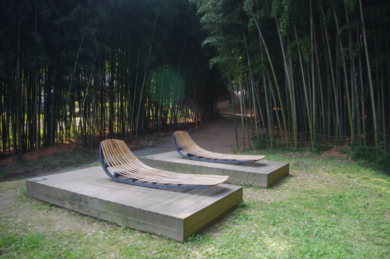 그 위에 또 작은 연못이 있고, 분수가 있습니다. 반대편에는 쉬어 가는 의자도 보입니다. 이렇게 대나무로 만들어진 의자가 곳곳에 있어 좋습니다. 다만 햇빛을 가릴수 없어서 여름에는 좀...
