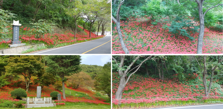 영광 지방을 들어서면서 저는 놀래지 않을 수 없었습니다. 왜냐하면 그 지방 자체가 대부분의 길을 상사화를 심어두어 어디를 가든 상사화를 구경할 수 있더라구요. 그냥 몇 군데가 아니라 어느 길이나 상사화가 지천에 널려있습니다.
