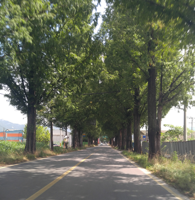 길 끝에 다다르면 메타스퀘이어 길이 나타납니다. 횡단보도를 건너면 되구요.
