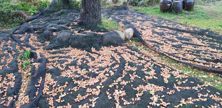 은행마을답게 은행이 많이 떨어져 있구요. 모으기 쉽게 그물을 깔아 놓았군요.
