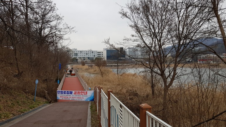다리를 건너면 순환러닝코스인데요, 그 앞쪽으로 단국대가 확연히 보이지요.