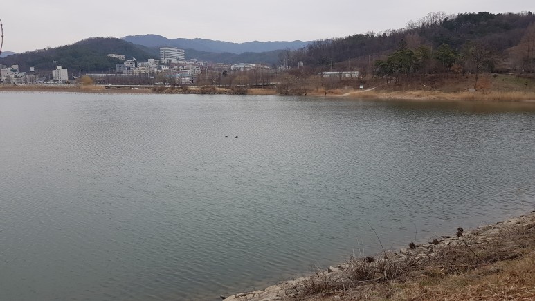 주차 후 시계 방향으로 한바퀴 돌도록 하겠습니다. 첫번째 풍경입니다. 저 멀리 반대편에 단국대 건물들이 보입니다.