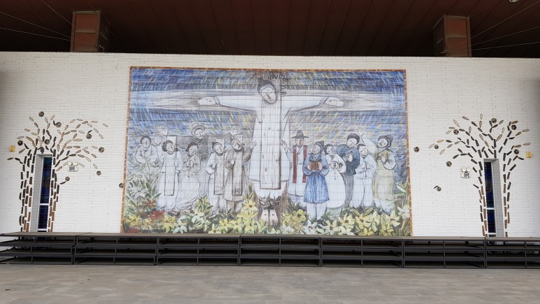 안쪽으로는 이런 그림이 그려져 있습니다. 중앙에 있는 십자가에 못박히신 분이 아마도 김대건 신부를 의미하는 듯 싶습니다. 그리고 복장이 모두 조선시대 복색이네요. 상징적인 의미가 느꺼집니다.