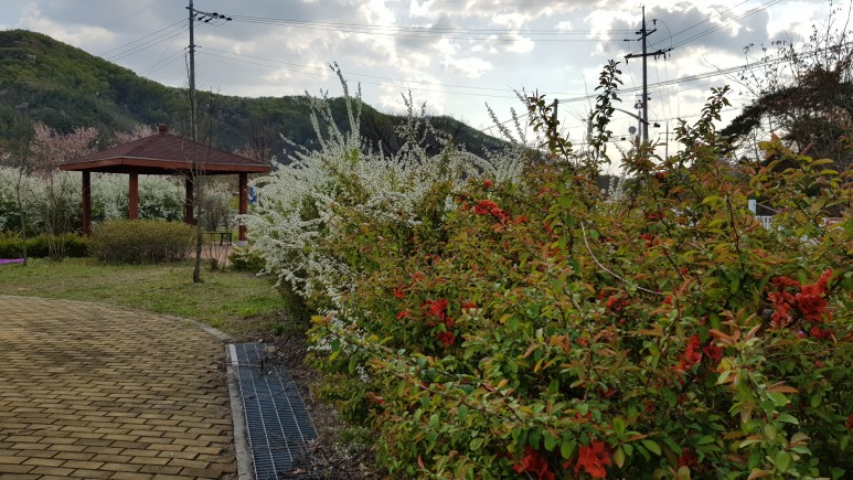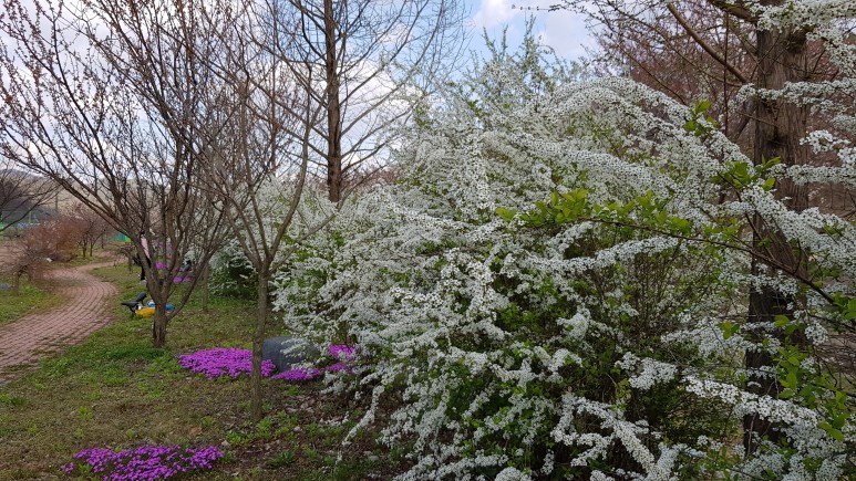 주변에 있는 꽃들입니다. 조팝나무도 보이구요. 이 조팝나무 꽃말은 헛수고, 하찮은일이구요, 우리나라에는 약 20가지가 있다고 합니다. 그래서 요즘 흰색꽃을 보면 대부분 조팝나무라고 보시면 되겠네요.