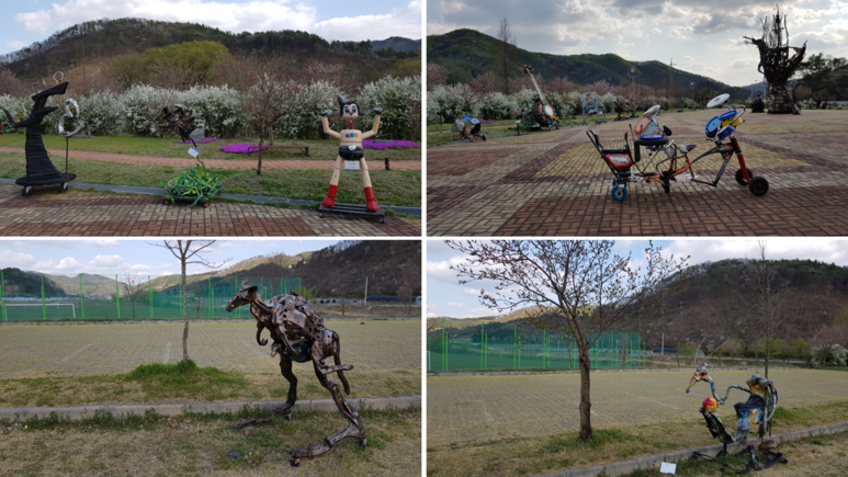 먼저 주변 안내도를 한번 보시겠습니다. 안내도를 보면 현재 위치가 1번 고추미 광장 근처라고 되어 있습니다. 그런데 이 옆에 있는 건물은 품바재생예술체험촌인데 그 앞 고추미 광장에 재생예술 작품들이 전시가 되어 있더라구요.