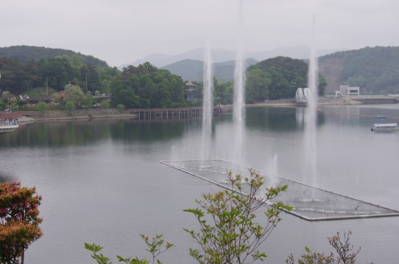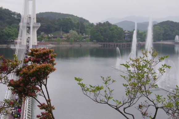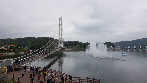 이제 예당호출렁다리가 나타납니다. 마침 분수쇼를 하고 있는 시간이 되었네요.