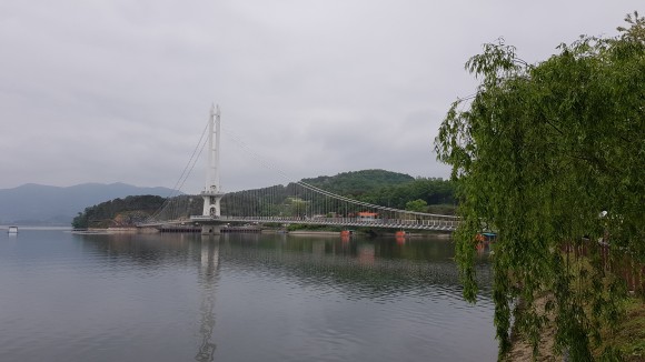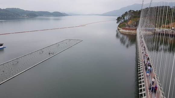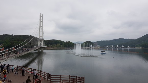 높지 않은 다리이지만 흔들림은 좀 있습니다만, 개인적으로 출렁다리 느낌은 그리 나지 않는군요. 하지만 아무래도 아래가 물이다 보니 조심은 해야겠지요. 그리고 여름에는 햇빛을 막아줄게 하나도 없으므로 양산이나 모자 준비하시기 바랍니다. 물론 물은 필수입니다. 여기도 둘레길을 걷는 분이 겸사 겸사 건너기에 좋은 곳이구요, 위험이 거의 없어 아무나 도전 가능한 다리입니다. 그래서 그런지 남녀노소 많은 사람이 보이더군요. 시간이 맞으면 분수쇼도 보시고 근처 둘레길을 걷는 걸 추천합니다. 출렁다리를 기준으로 걸으면 약 1시간 이상 소요가 됩니다.