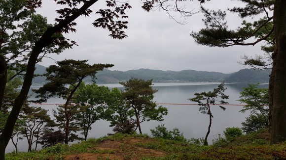 조각공원으로 올라가면서 호수를 바라봅니다. 그런데 보시면 아시겠지만 사진마다 분홍색 선이 보이는데 저수지에 있는 것인데 좀 보기가 좋지 않네요.