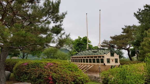이제 주차장 앞 도로까지 왔는데 거북선 조형물이 보이네요.