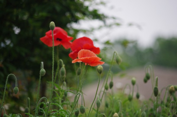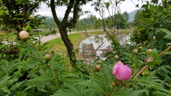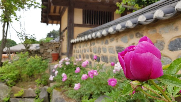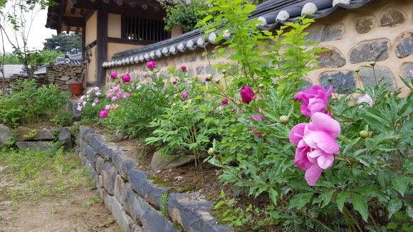 가는 길 오른쪽에 집들이 있는데 이렇게 꽃들을 심어 두었습니다. 작약과 꽃달맞이입니다.