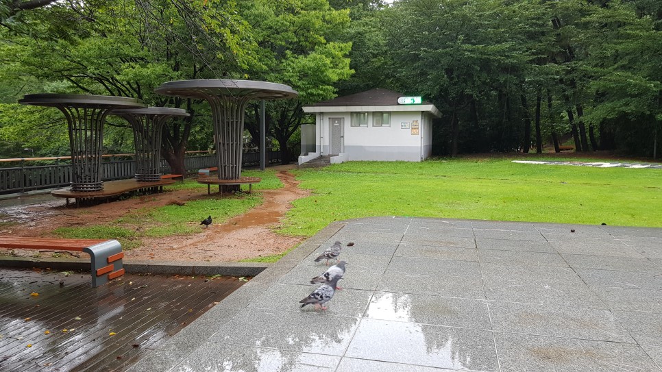 그리고 화장실은 주차장 바로 위쪽에 있으니 이용을 하시면 됩니다. 비가 오는 중에 비둘기들도 비를 피하고 있나 보네요.