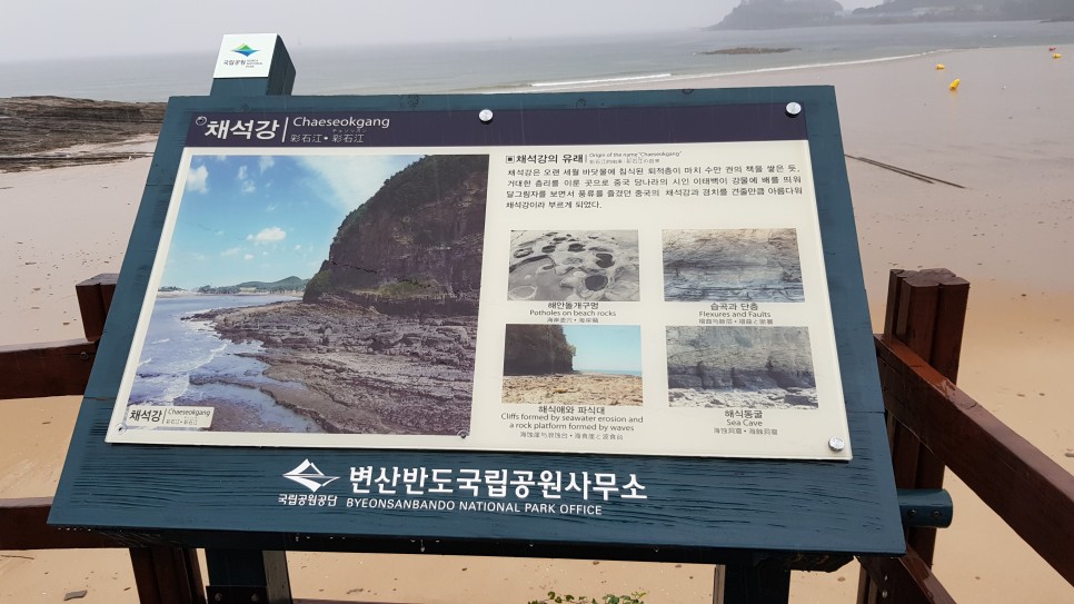 부안 채석강은 격포해수욕장 바로 옆에 있는 절벽과 그 앞 암석들을 볼 수 있는 곳으로 중국 당의 이태백이 배를 타고 술을 마시다가 강물에 뜬 달을 잡으려다 빠져 죽었다는 채석강과 흡사하여 붙여진 이름입니다. 지형이 중생대 백악기 화강암이 주를 이루고 있는데 퇴적층이 책처럼 쌓아 놓은 듯하여 풍경이 좋은 곳으로 유명하지요. 1976년 전라북도 기념물도 지정 후 2004년에 명승지로 등록이 되었네요.