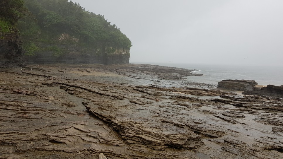 부안 채석강은 절벽과 암석이 보기 좋은 곳인데 제가 갔을 때는 물이 빠진 날이라 물이 빠진 암석들의 모습을 구경할 수 있어서 좋았습니다. 다만 비가 와서 모든 사진에 비 내리는 모습이 함께 찍힌 것이 아쉽지요. 아마도 일반적으로는 물이 들어오게 되면 근처에서 구경을 하게 되겠지만 물이 빠지면 암석 위를 걸을 수 있는데 암석 위 이끼들로 인해 너무 미끄러워서 위험하더라구요. 어쨌거나 절벽과 암석의 모습이 무척 인상적인 곳입니다. 저는 바위 위를 걷느라 시간이 좀 걸렸는데 30분 정도 소요가 되었지요.