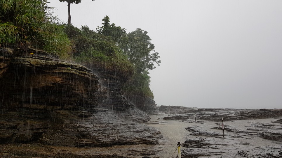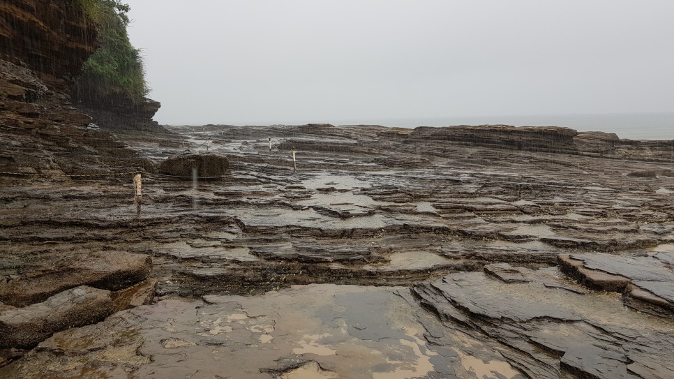 아래로 내려가서 조금 걷다 보니 왼쪽으로 절벽이 보이고 바로 앞으로 한 겹씩 쌓아 올린 듯한 바위들의 모습이 펼쳐지더라구요. 지금은 물도 빠진 상태이고 비가 오고 있는 중이라 이렇게 보이지만 날씨에 따라 다른 모습을 볼 수 있을 것 같더라구요.