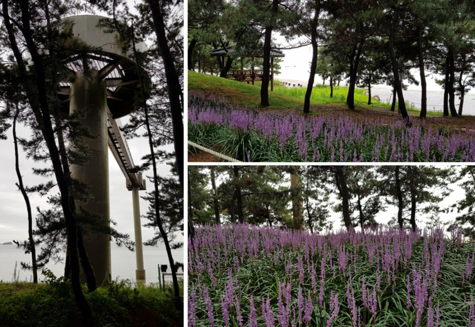서천 장항스카이워크는 서천 장항송림산림욕장이 있는 곳에 위치한 곳으로 바로 바닷가에 만들어진 스카이워크입니다. 다른 곳의 경우 대부분이 바닥이 유리로 많이 만들어져 있는데 이곳은 유리는 아니고 철망 형태를 이용하여 만들어진 곳이어서 그렇게 무섭지는 않더라구요. 다만 높이가 있어서 그 높이 때문에 무서움을 느끼는 것이지요. 그리고 이곳으로 가는 길이 송림숲이 있는데 이곳에 좋은 볼거리가 있습니다. 바로 맥문동 동산인데 소나무 사이를 모두 맥문동을 심어 놓아 보기가 아주 좋더라구요. 맥문동이 이렇게 이쁜지는 처음 알았습니다.