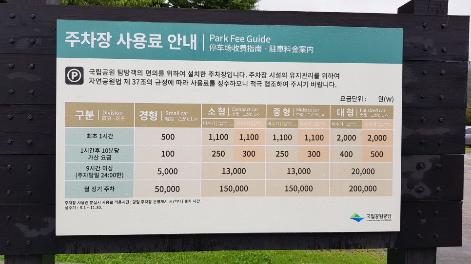 - 주차료: 소형 기준 최초 1시간 1,100원, 10분당 250원(비수기) 또는 300원(성수기)