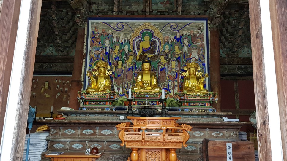 그 앞에 보이는 건물이 바로 대웅전입니다. 대웅전은 석가모니불을 모시는 곳으로 도력과 법력으로 세상을 구제하는 영웅을 모시는 전각이라는 의미를 가지고 있지요. 이 안쪽에 후불벽화가 있는데 우리나라에서는 가장 규모가 크다고 하지요.