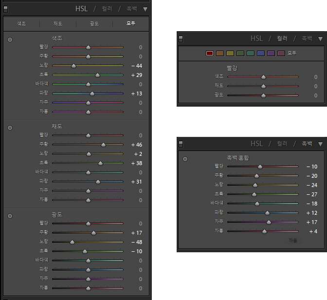 다음 부분은 HSL, 컬러, 흑백에 대한 상에 보정이 가능한 부분이구요. 하나씩 클릭해보면 사용 가능한 옵션이 다르게 표시됩니다.