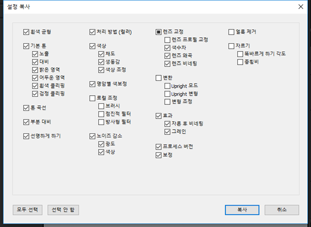 그리고 맨 아래에 보이는 복사와 붙여넣기 메뉴는 현재 선택된 사진에 보정한 작업을 복사해서 다른 사진에 똑같이 적용할 때 사용하는 기능인데 비슷한 상황에서 찍은 사진인 경우만 사용이 가능하겠지요. 연사로 찍었거나 한 경우겠지만 다른 곳에서 찍은 경우는 효과가 덜할 것 같아요. 복사를 클릭해 보시면 복사할 보정 항목을 선택할 수도 있지요.