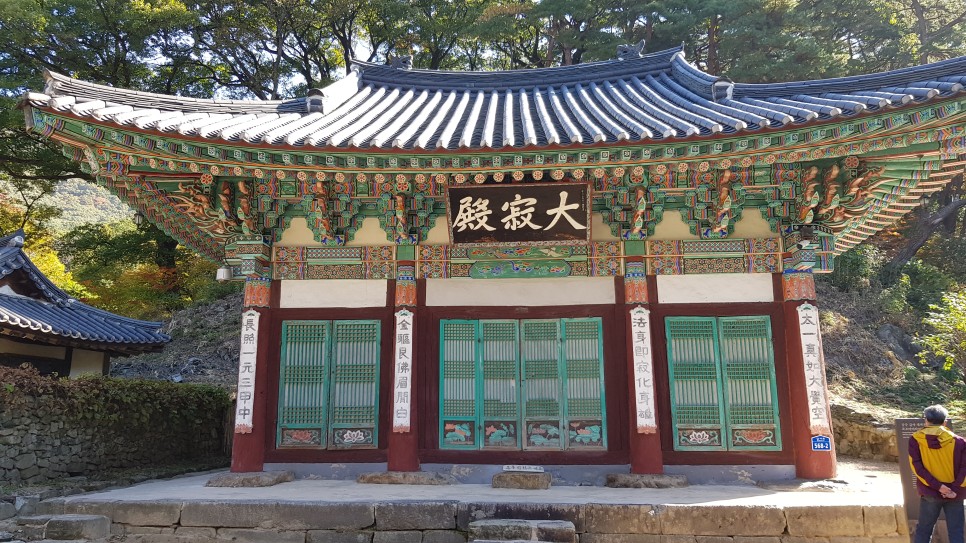 이어서 나타난 건물은 대적전입니다. 대적광전이라고도 하는데 비로자나불을 중심으로 삼신불을 보시는 법당입니다. 신라 통일 후에 대웅전이 이 자리에 있었다고 하네요. 이 법당 안에는 목조아미타여래삼존불이 모셔져 있다고 하지요.