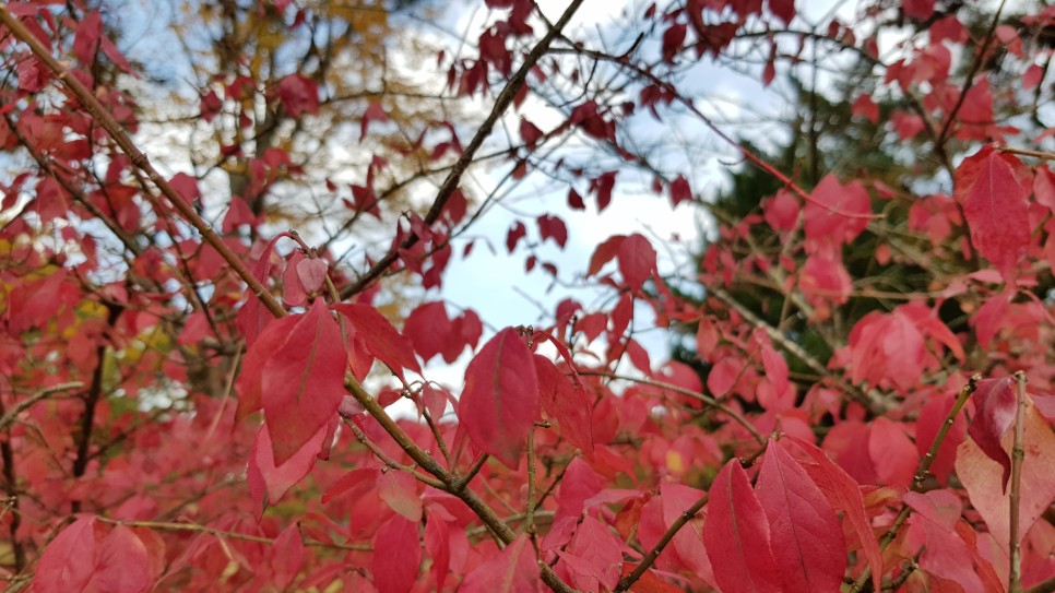 그리고 붉은색의 나무가 많이 보이는 데 이 나무들이 화살나무입니다. 붉은색이 강하다면 대부분이 이 나무일 가능성이 많지요.