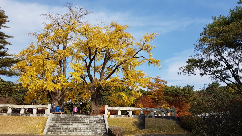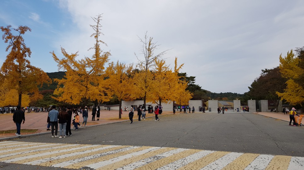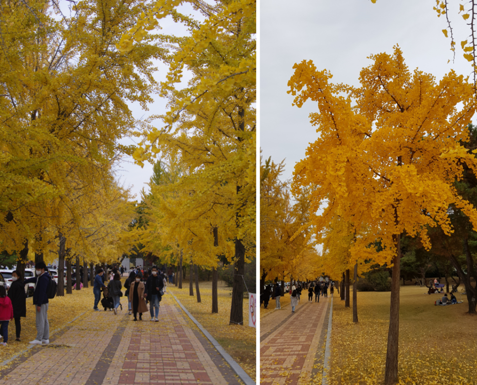 주차장은 현충사 매표소 입구에 큰 주차장이 있지만 유명한 만큼 주차가 쉽지는 않습니다. 가능하면 오전에 가시면 조금 쉬운 편이지만 주변 갓길에도 주차를 많이 하시지요. 현재 주차장 근처에는 은행나무들이 완전히 물이 들어서 너무 좋은 모습을 볼 수 있었습니다. 바로 옆이 곡교천은행나무길인데 거기는 아직 반 정도밖에 물이 안 들었거든요. 여기는 완전히 둘이 들었네요. 같은 지역인데 왜 이렇게 차이가 날까요?