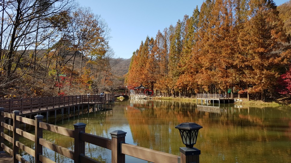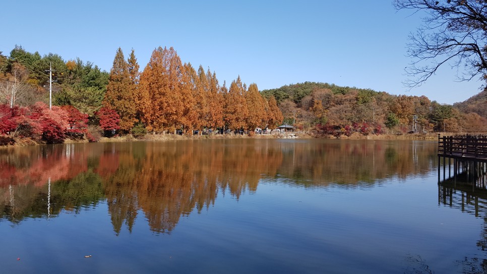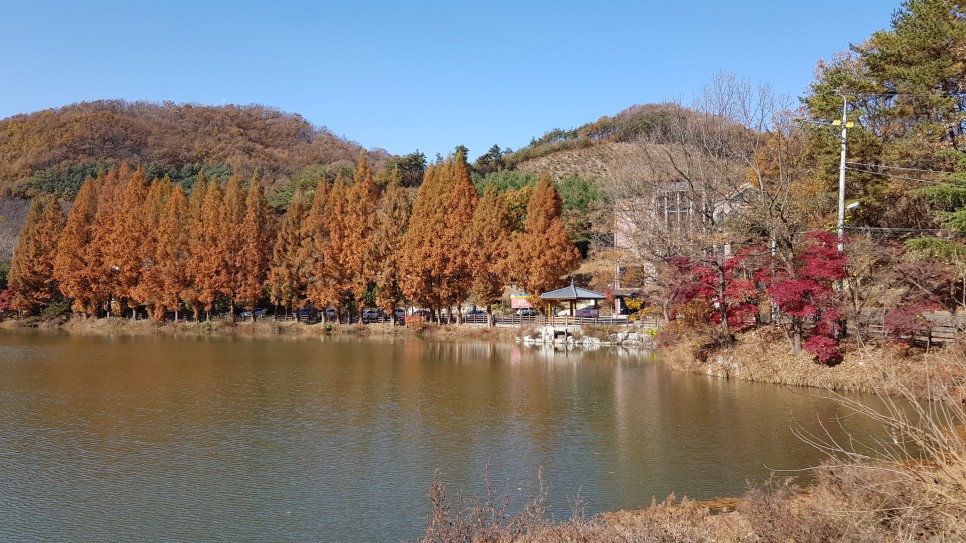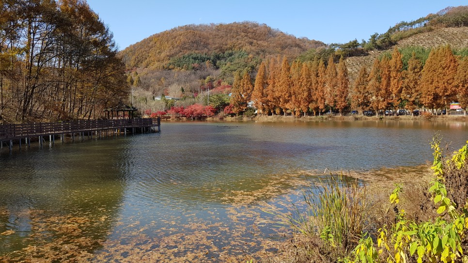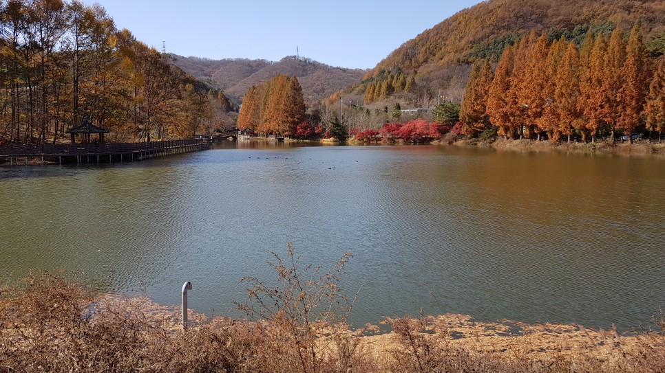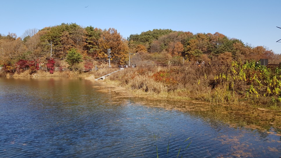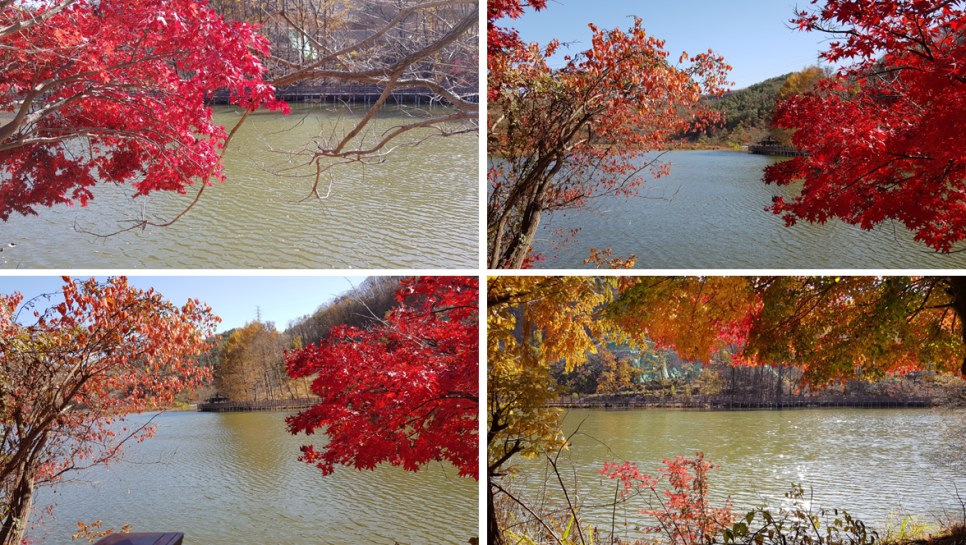 저수지는 크기가 작은 편이어서 한 바퀴 도는데 시간이 많이 걸리지는 않을 것 같아 보입니다. 저 가까운 곳이 반대편 지점이군요. 전체적으로 빨간색과 갈색의 단풍이 많아 가을 냄새가 많이 나는 곳이네요.