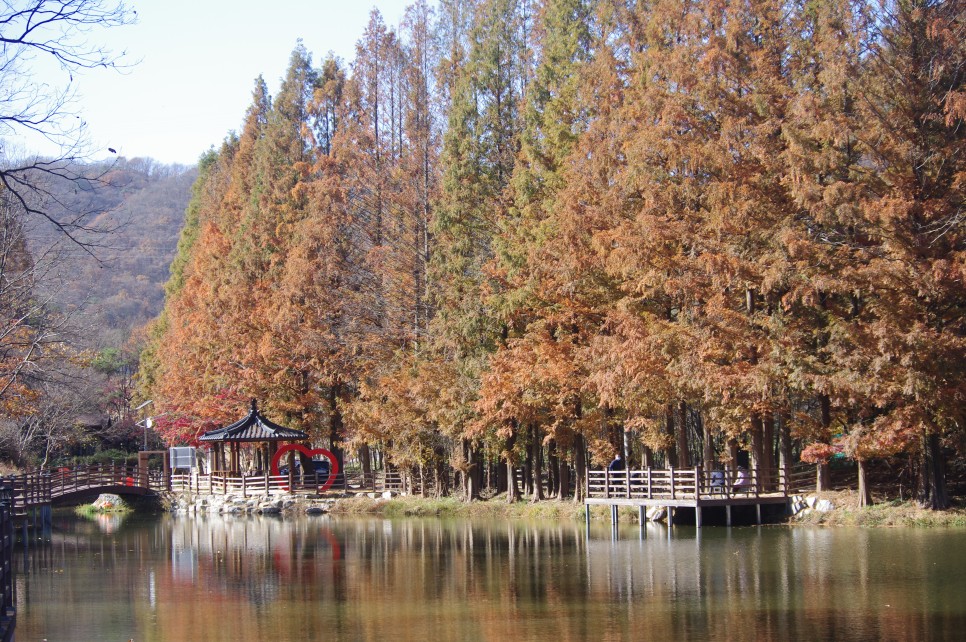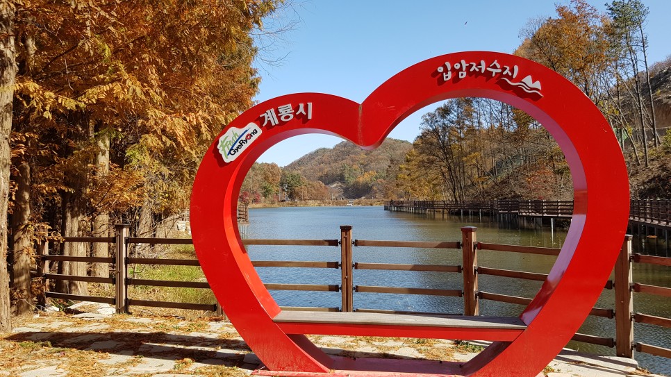 두 번째 정자 근처에는 작은 다리도 보이고 하트 모양의 포토존도 있더라구요. 작은 곳이니 이곳의 풍경을 오래 감상하기 위하여 천천히 움직이고 있습니다. 저수지의 물색마저 가을을 담고 있는 것 같지요.