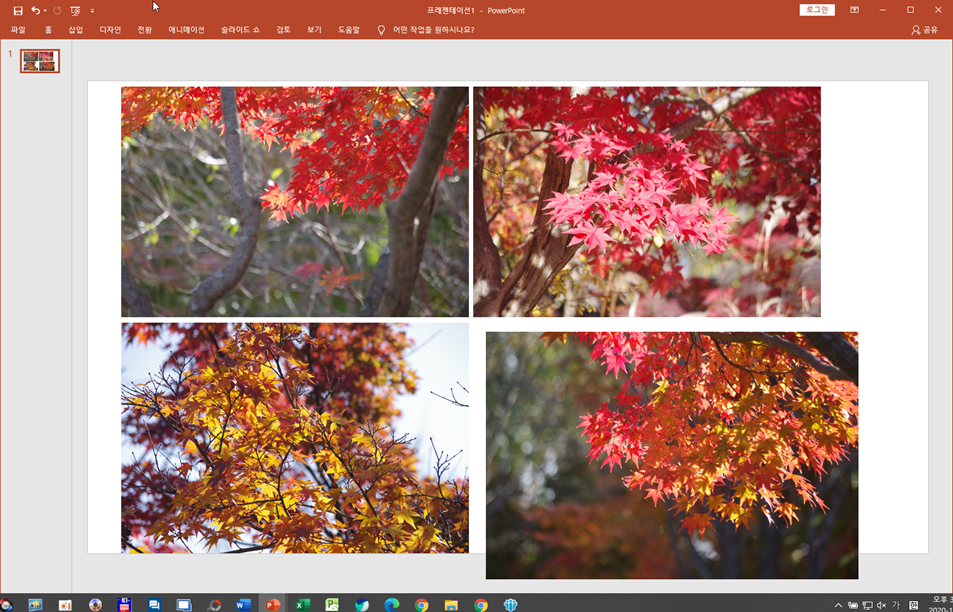 이 방법은 여러 장의 사진 이미지를 파워포인트 문서 내에 넣고 크기를 조절하면 끝이기 때문에 가장 쉬운 방법이지만 한 가지 단점은 사진의 화질이 좀 떨어질 수 있다는 것이지요.
