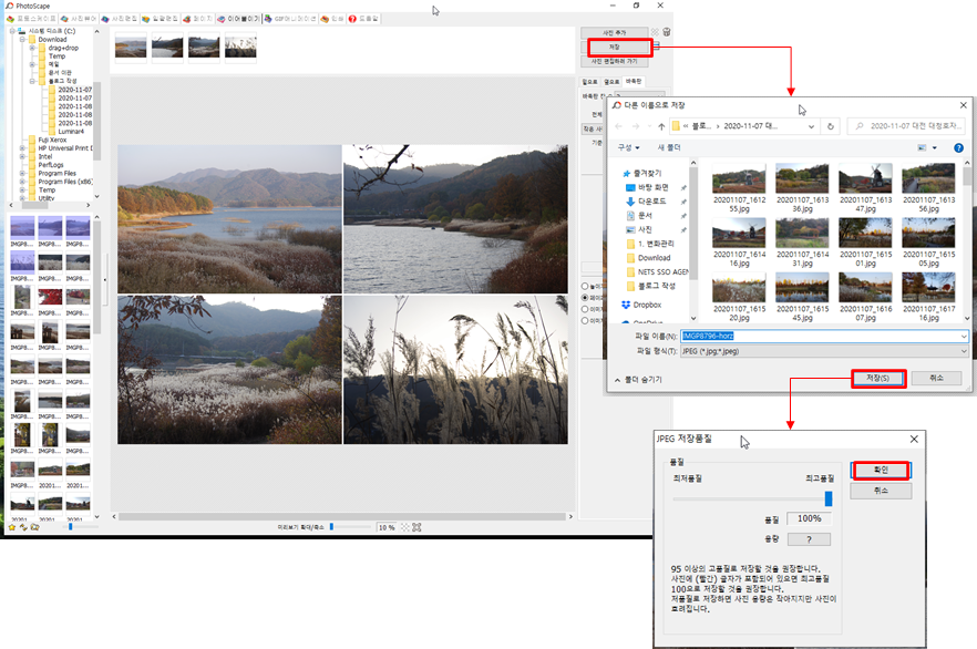 6. 그러면 사진 사이 공간이 조금씩 띄어지고 사진이 정렬이 됩니다. 그런 다음 “저장"을 클릭하여 새로운 이미지로 저장을 하셔서 사용을 하시면 되지요. 사진 품질은 최고로 주시면 돼요.