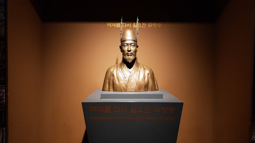 무령왕의 흉상도 보입니다. 무령왕릉은 백제의 전통적 무덤 형식이 아니라 중국 남조의 무덤 양식으로 축조되어 백제의 선진문화 수용과 활용을 보여주는 것이라고 하지요. 그리고 부장품도 4,600여 점에 달하고 다양해서 백제인의 정신과 높은 문화적 역량을 보여주는 것으로 동아시아 및 삼국관계에서의 백제의 위치를 이해하는데 매우 중요한 실마리가 된다고 합니다.