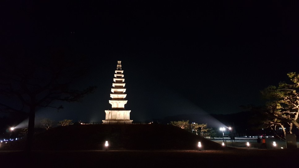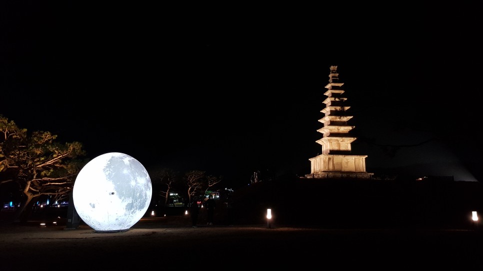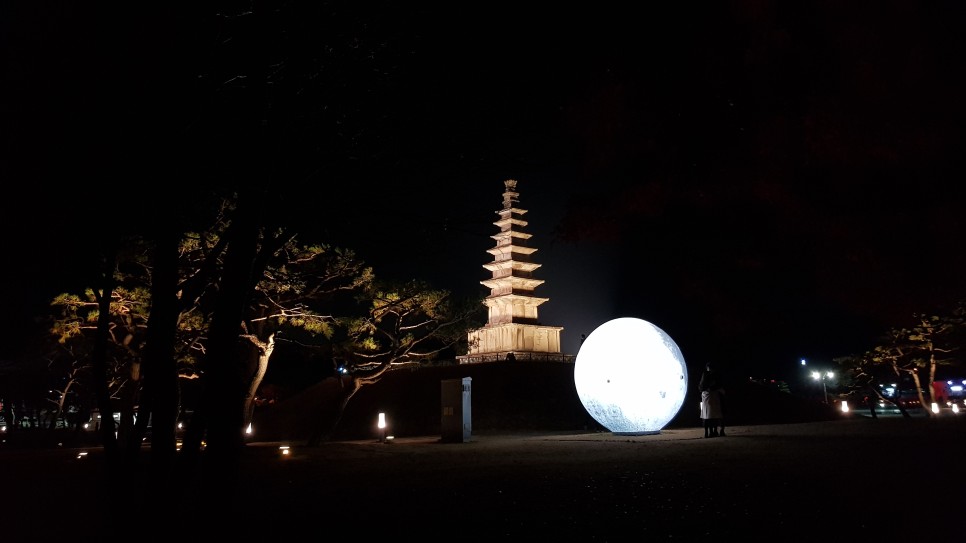 이제 이곳의 핵심인 탑의 모습을 구경하도록 하겠습니다. 충주탑평리칠층석탑인데 이곳에도 조명 시설이 되어 있어 멋지구요. 특히 옆에 달 모양의 조형물이 있어 더욱 운치가 있는 것 같아요. 달이 땅으로 떨어진 듯한 모습인데 누구의 아이디어였을까요?