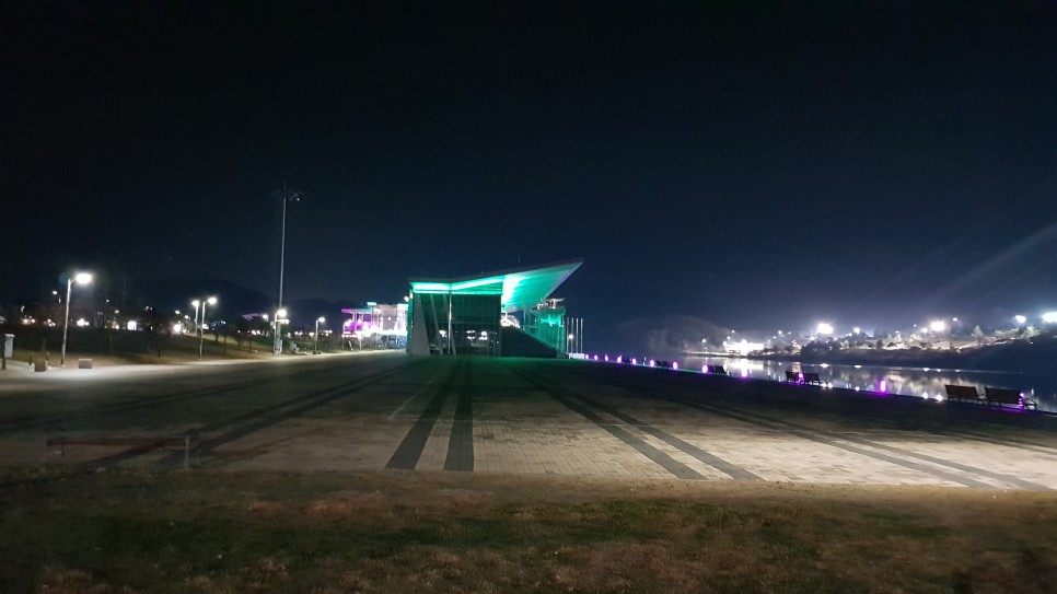 저 멀리 보이는 건물은 탄금호조정경기장입니다. 저기까지 갈 필요는 없을 듯합니다. 밤에는 조금 추워서 오래 걷기가 싫어지더라구요. 멀리서 보는 것이지만 야경을 위해 신경을 많이 쓴듯 하네요.