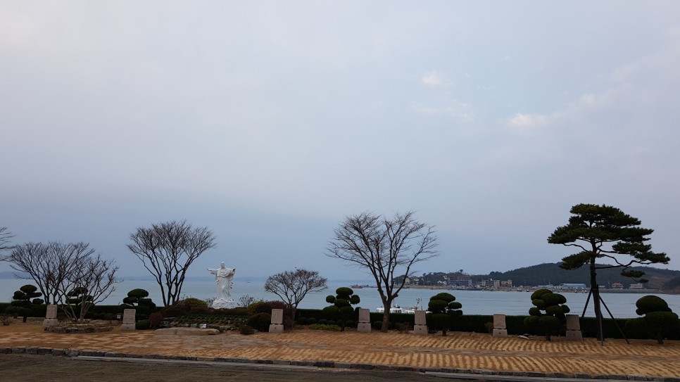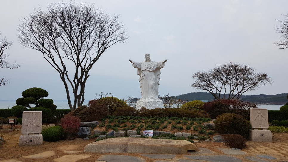 먼저 앞 마당의 우측은 바다가 보이는 곳으로 바다 쪽을 보는 풍경이 좋더라구요. 여기에 예수님상이 있는데 그 주변은 마지막에 더 구경을 하기로 하고 먼저 성당 쪽으로 올라가 봅니다.