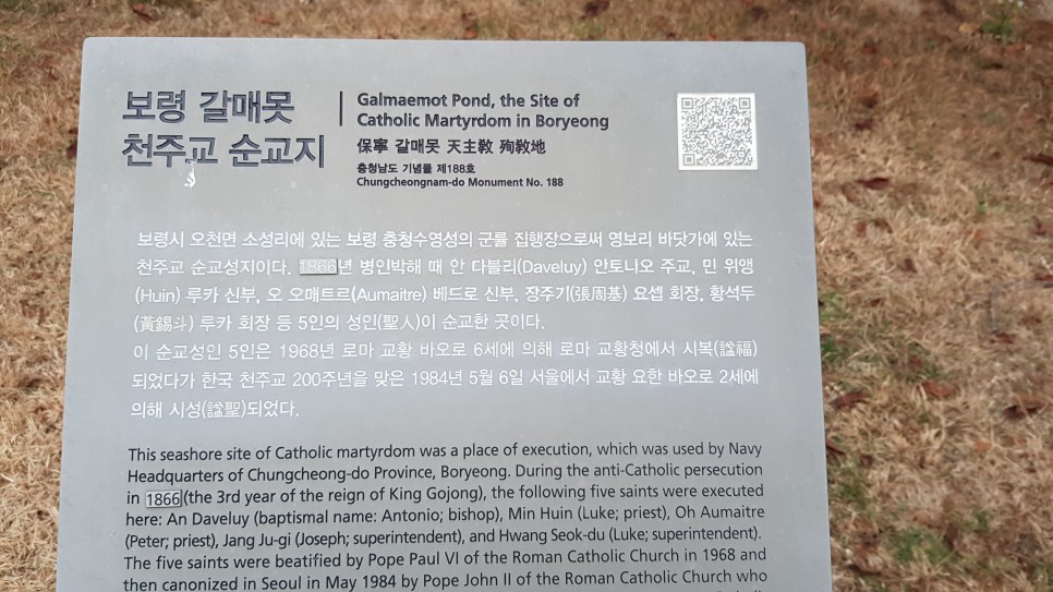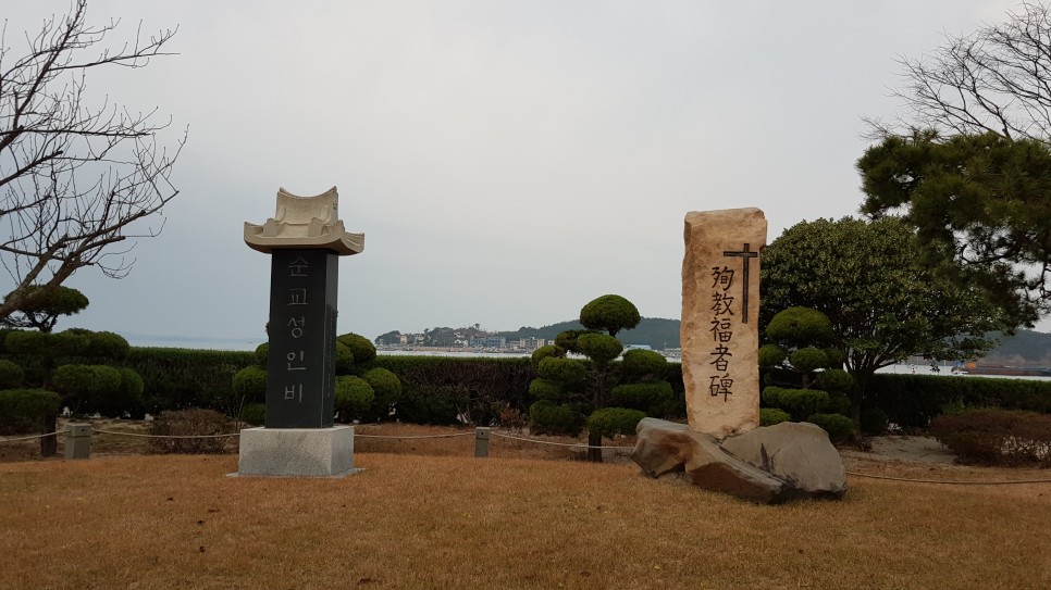 먼저 갈매못이라는 이름은 현재의 위치가 과거에 목마른 말이 물을 먹는 모습과도 같은 명당이라고 하여 갈매연 등으로 불리었는데 이 갈마연에서 따온 것이 갈매못이라지요. 이 갈매못이 박해의 형장이 된 것은 1866년 흥선대원군이 서양오랑캐를 내친다는 의미에서 프랑스 함대 세실 사령관이 침범했던 외연도에서 가까운 오천의 수영을 택하여 5명의 주교들을 끌고 와서 처형을 했다고 하지요. 이곳은 1925년 정규량 신부에 의해 순교현장이 발견되고 이를 토대로 부지 매입 등을 거쳐 오늘에 이르게 되었다고 합니다.