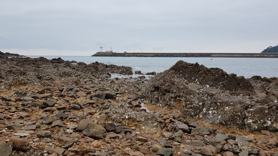 할미할아비바위로 가는 길은 이렇게 날카로운 돌들이 많이 깔려 있는 길이라 걷는데 조금 불편하기는 하지만 천천히 걸으면 쉽게 움직일 수는 있는 길이지요. 가끔 이 길을 가면서 뭔가를 잡는 분들도 보이는데 아마도 조개나 석화를 따는 것인 듯합니다. 결국 이 길도 물이 많이 들어오면 바다가 되는 곳이라는 얘기지요.
