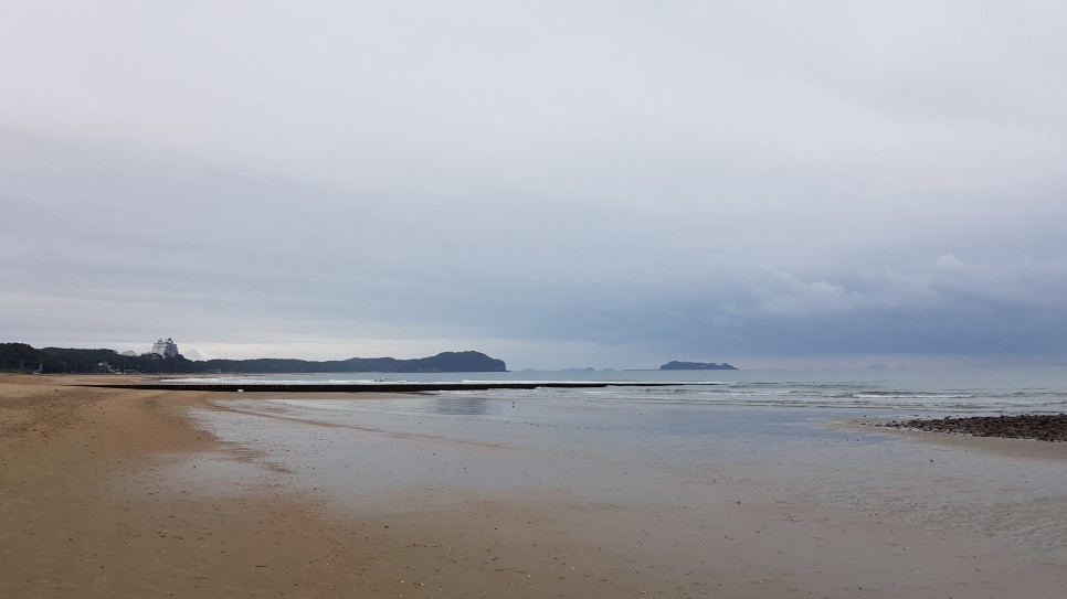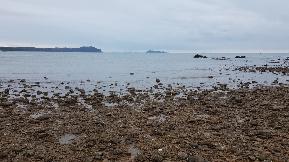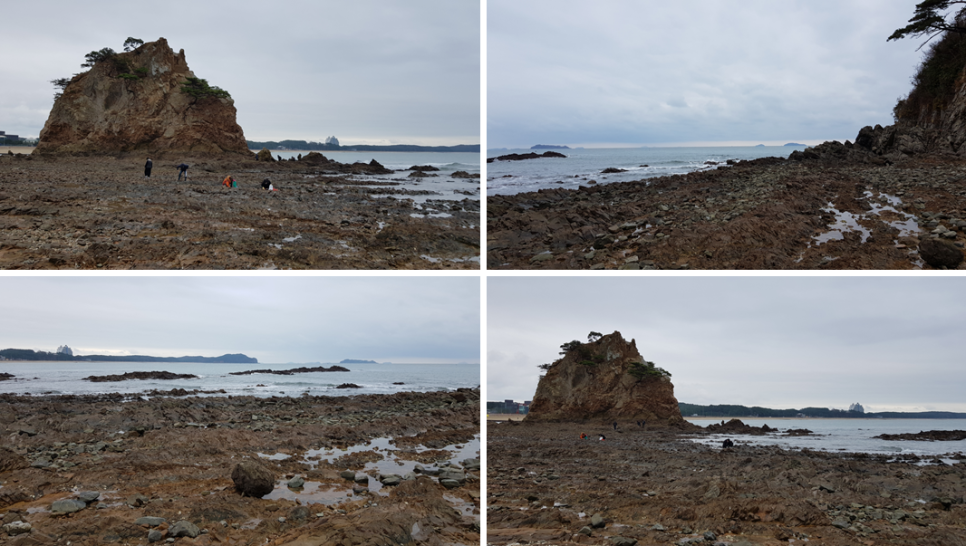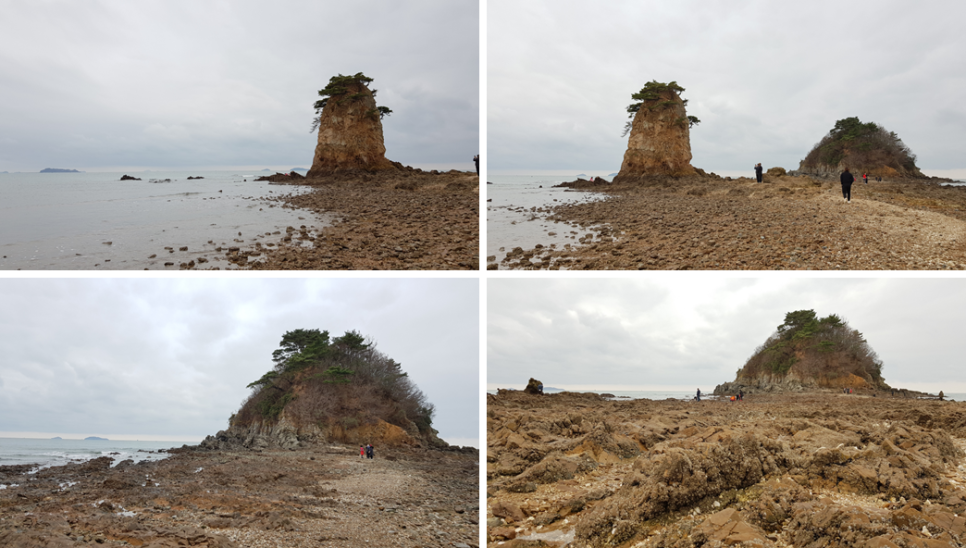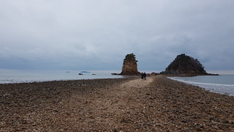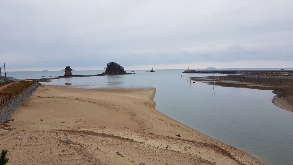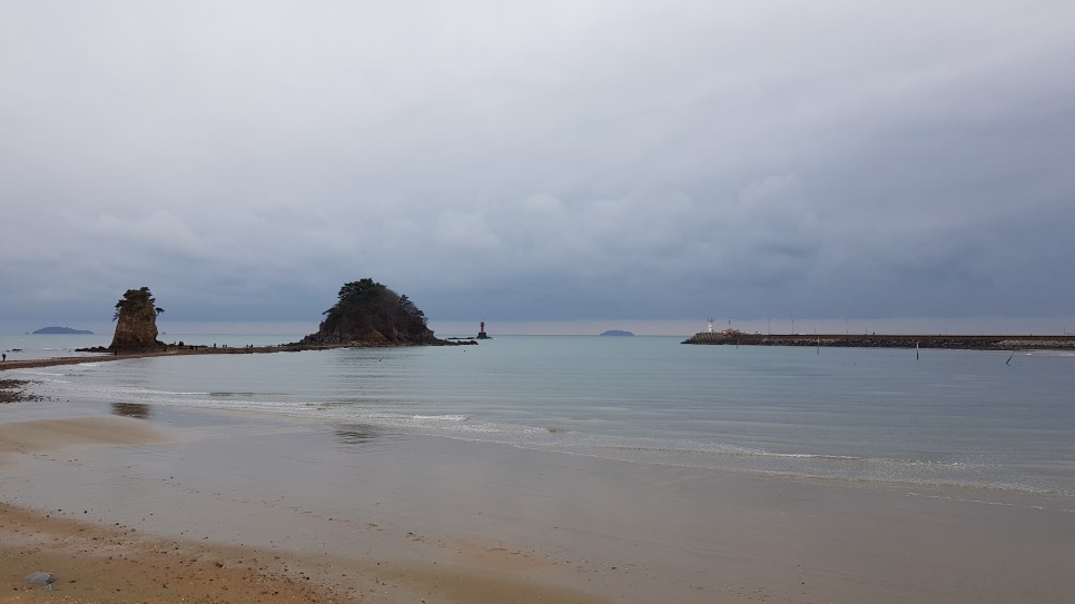 해변으로 가면서 저 멀리 바라보면 할미할아비바위가 우뚝 모습을 들어내고 있는 게 보입니다. 모래사장에서 아주 가까이 있고 현재 물이 조금 빠진 상태인지 바위까지 걸어서 가 볼 수도 있는 것 같아요.