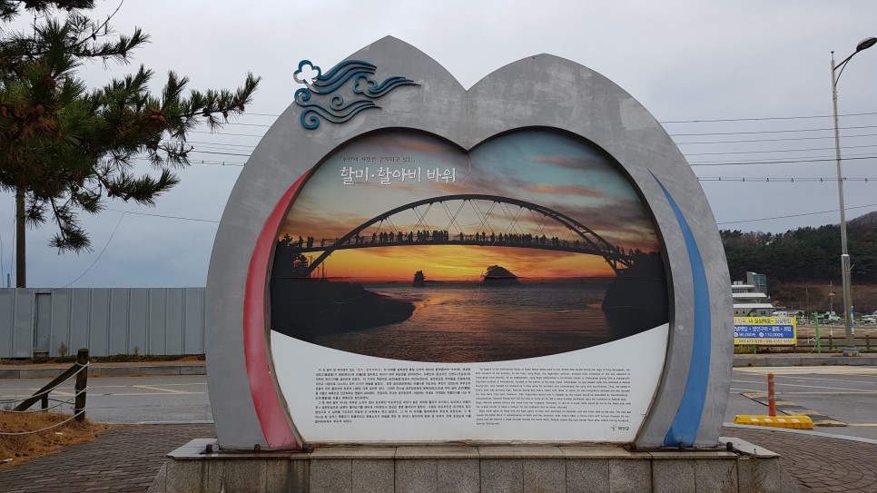 태안 할미할아비바위는 태안 꽃지해수욕장에 있는 바위로 이 바위에는 작은 전설이 있습니다. 아주 오래전 1,150년 전에 승언 장군에게는 아름다운 부인이 있었는데 어느 날 상부의 명령으로 장군은 출정을 했고 부인 미도는 날마다 견승포 바위에 올라 속을 태우며 남편을 기다렸다고 합니다. 그렇게 수년을 기다리던 부인은 바위 위에서 죽었는데 그 바위가 부인의 모습으로 변했고, 그 옆에 커다란 바위 하나가 더 솟아올랐다고 합니다. 그래서 할미할아비바위라고 불린다네요.
