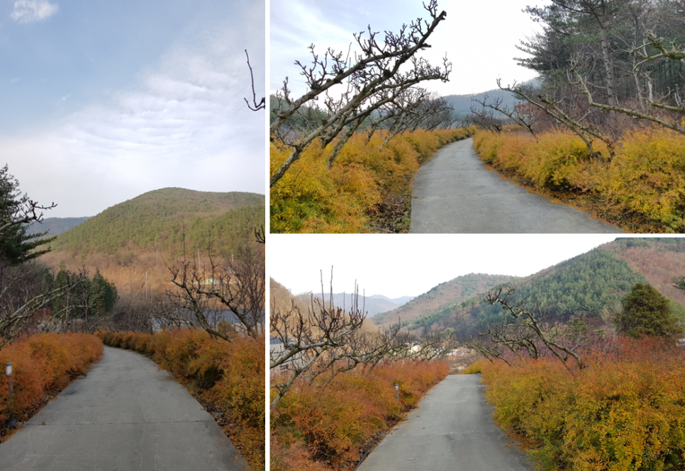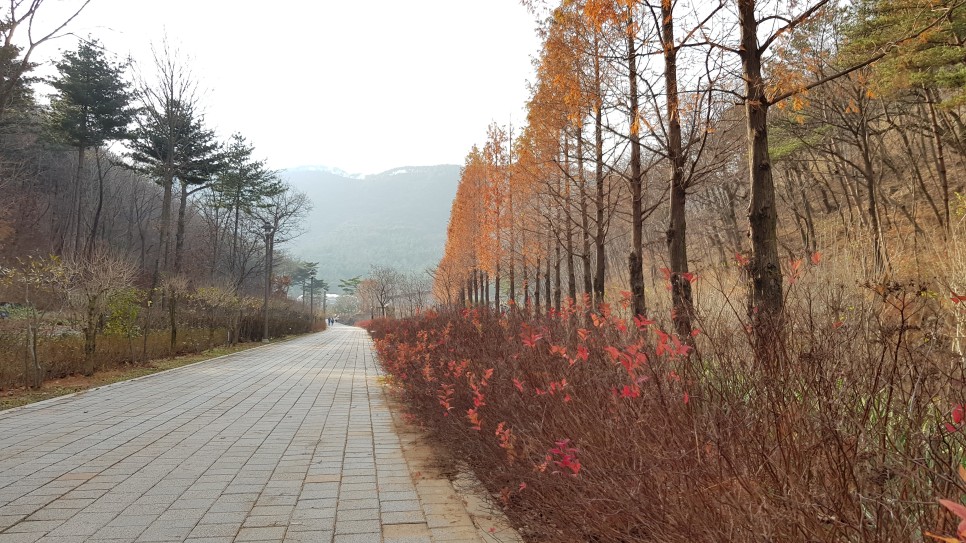 그리고 가는 길은 메타스퀘이어 나무들이 있어 가을 풍경이 좋고 아래쪽에도 빨갛게 물이 든 작은 나무들이 쭉 심어져 있어서 멋지더라구요.