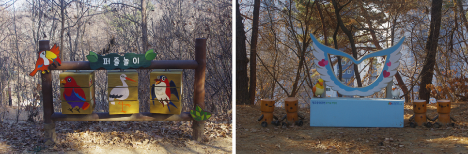 길을 따라가면 유아숲체험원이라는 곳이 나타납니다. 주변이 유아들이 좋아할 만한 조형물들을 만들어 둔 곳인데, 그중에서 몇 가지를 찍어봤습니다. 신경을 많이 쓴듯하네요.