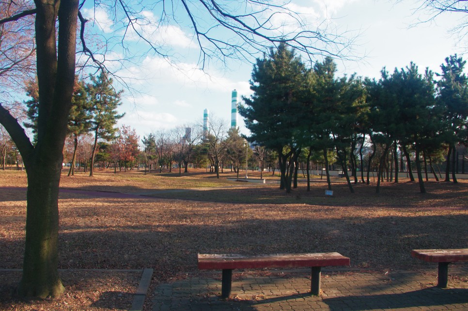 공원 쪽으로 보이는 풍경은 이렇습니다. 근린공원의 전형이라고 생각이 되는데 틀린 점이 있다면 건물 굴뚝들이 보이는 점이지요. 이 근처가 아산국가산업단지이기 때문입니다.