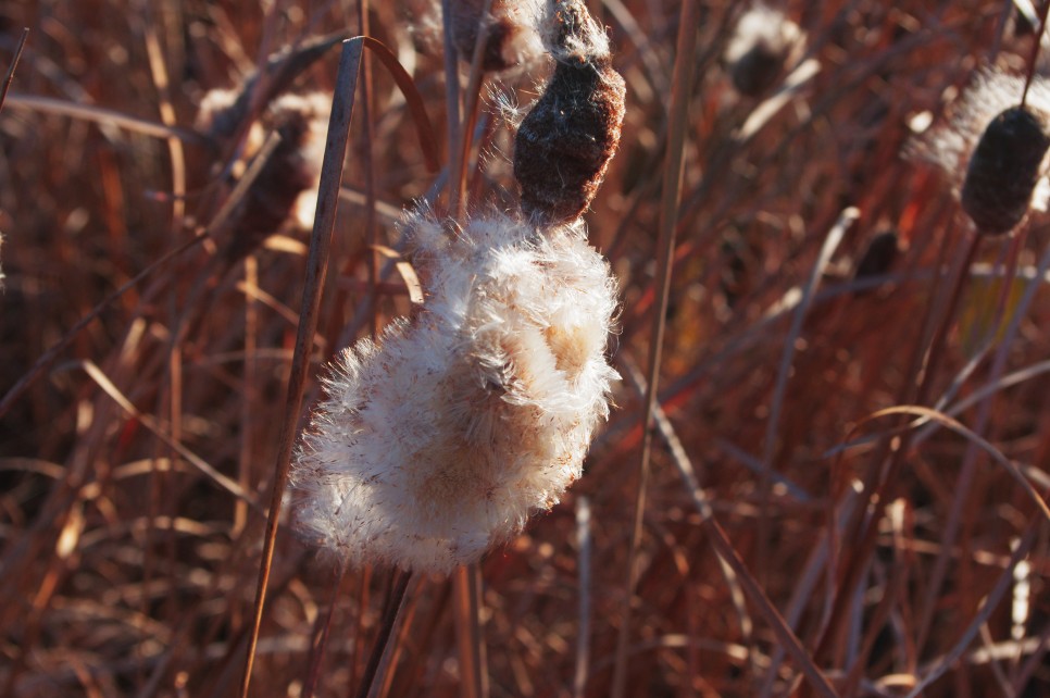 그리고 부들의 모습도 보이는데 소시지 같은 모양의 열매가 인상적인 것으로 누구나 갑자기 핫도그가 먹고 싶게 하는 마력을 지닌 식물이지요. 그런데 이 열매를 살짝 만지면 펑 터지면서(?) 솜털들이 바람에 날리는 것을 오늘에야 알았습니다. 저는 이것이 딱딱할 줄 알았거든요. 한번 만져 보시기 바랍니다. 신기하네요.
