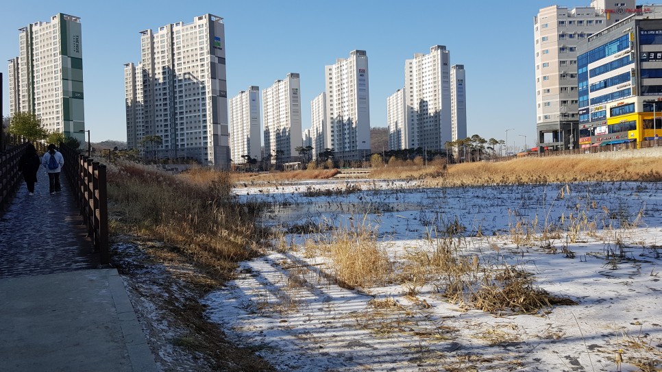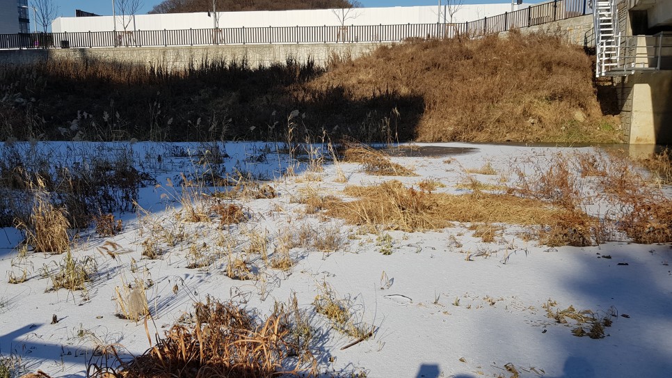 이쪽은 하천 넓이가 커지는 것으로 보아 작은 습지를 이루고 있는 것 같네요. 여러 곳에서 흐르던 하천이 만나는 지점입니다. 주변에 아파트 단지와 상가들이 많은 도심의 모습이지만 이렇게 겨울 하천을 보니 풍경은 나름 나쁘지는 않아 보입니다. 하지만 개인에 따라 이게 뭐 볼 게 있다고 하고 말하는 이도 있을 것 같아요.