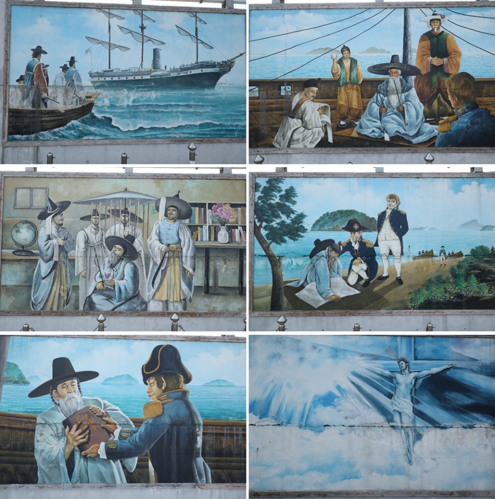 그렇게 구경을 끝내고 주차가 되어 있는 곳으로 가는데 방파제 벽에 다른 그림들이 보입니다. 이 그림들은 이 마량포구가 성경이 최초로 들어온 곳임을 나타내는 것들인데 주변에 한국최초성경전래기념관 및 기념공원이 있지요. 한국최초성경전래기념관 및 기념공원에 대해서는 따로 소개를 해 드리도록 하겠습니다.