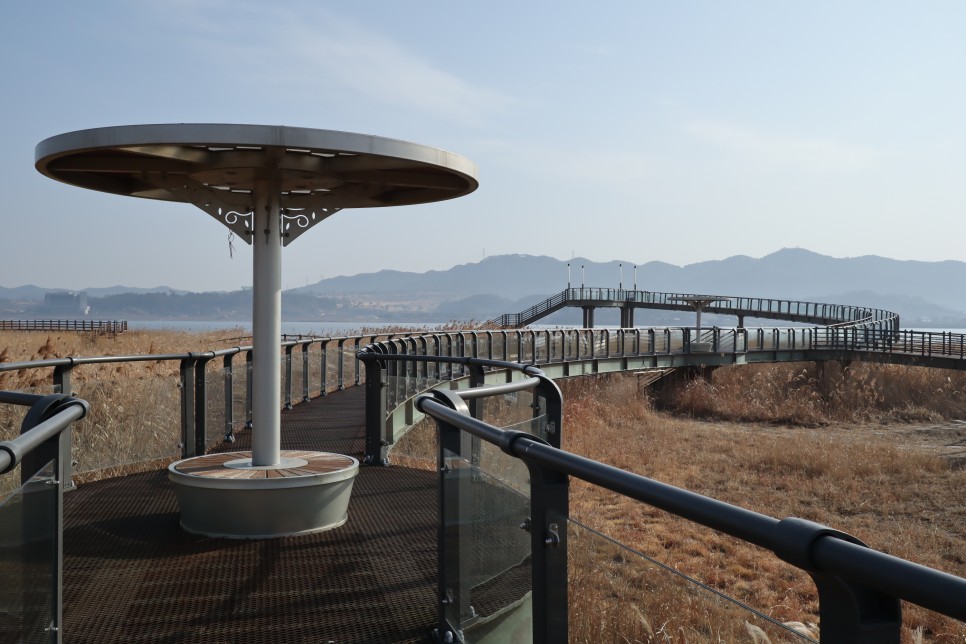 이제 이 나무 데크 산책로를 따라 걸어가도록 하겠습니다. 아래쪽 산책로로도 갈 수는 있지만 갈대들의 키가 커서 아래쪽에서는 풍경을 보기가 힘들 것 같아서 위쪽으로만 돌아 보았지요.