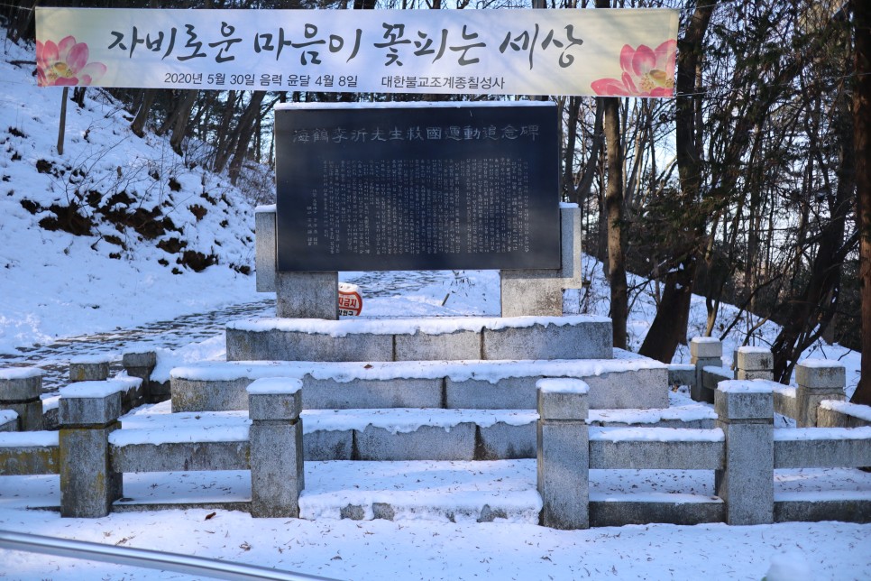 그리고 이어서 칠성사로 올라가는 입구에 다른 비석이 하나 있는데 해학 이기선생 구국운동 추념비입니다. 해학 선생은 1894년 동학농민운동 시 민씨정권 전복을 제의하기도 했고 1905년 을사조약에 체결되자 한성사범학교 교관으로 후진 양성도 하고 사회계몽운동을 전개하기도 했다고 합니다. 1909년 세상을 떠났는데 이 비석은 1983년에 건립을 했지요.