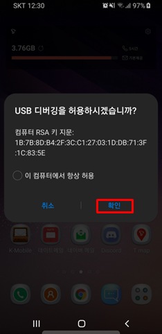 그런 다음 스마트폰 연결을 뺏다가 다시 연결해 봅니다. USB 디버깅 허용 창이 뜨면 확인해 줍니다.