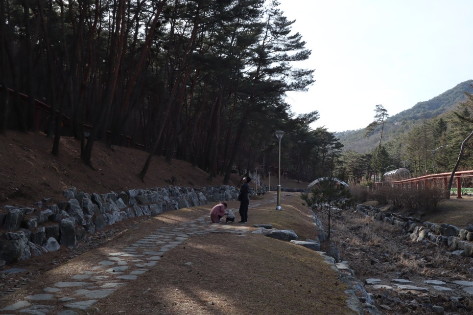 속리산숲속여행의 산책로로 가 보는데 사람들이 가끔은 보이기는 합니다. 대부분 아이들이 있거나 가족 단위인 것 같아요. 산책로의 오른쪽은 작은 개울인데 겨울이라 역시 물을 보기가 힘이 듭니다.