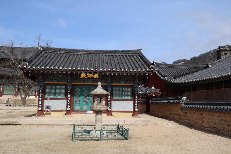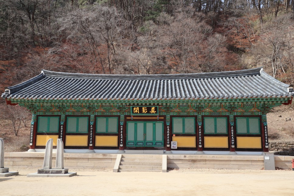 다시 반시계 방향으로 돌아서 보면 이 진영각이 있습니다. 이 건물은 고승대덕의 영정을 봉안한 곳이지요. 그 앞에 당간도 보이네요.